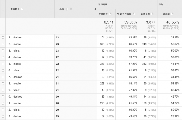 To know what device your visitors use to browse your website during what time period, you can use the "action" report in the google analysis target audience, with the secondary dimension "hour" to understand the source of the visitor's device at each time period.
